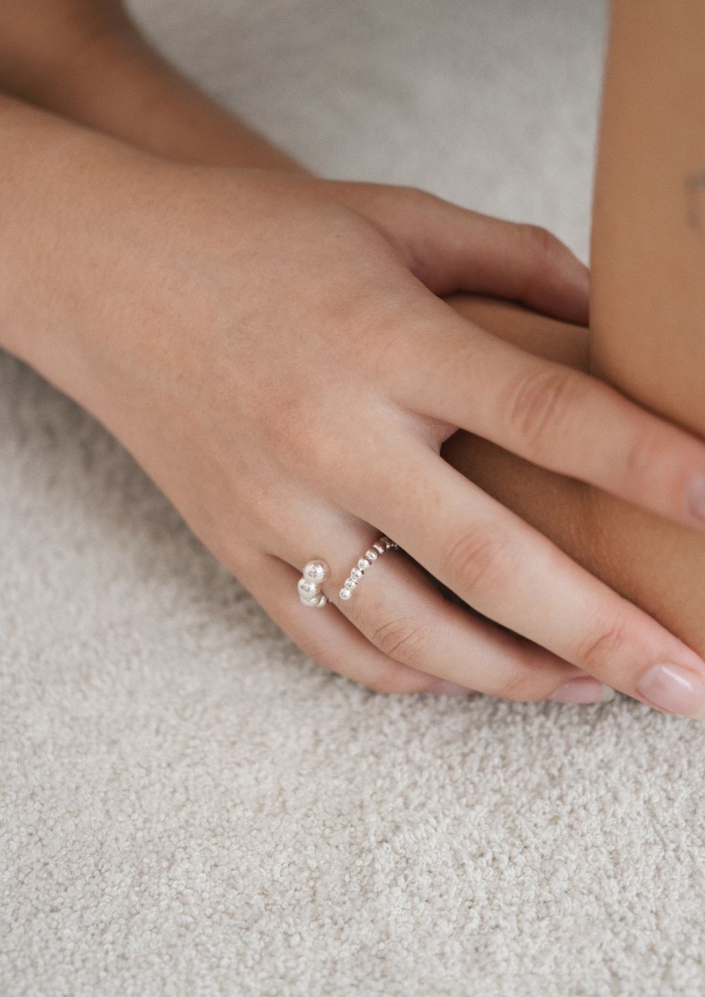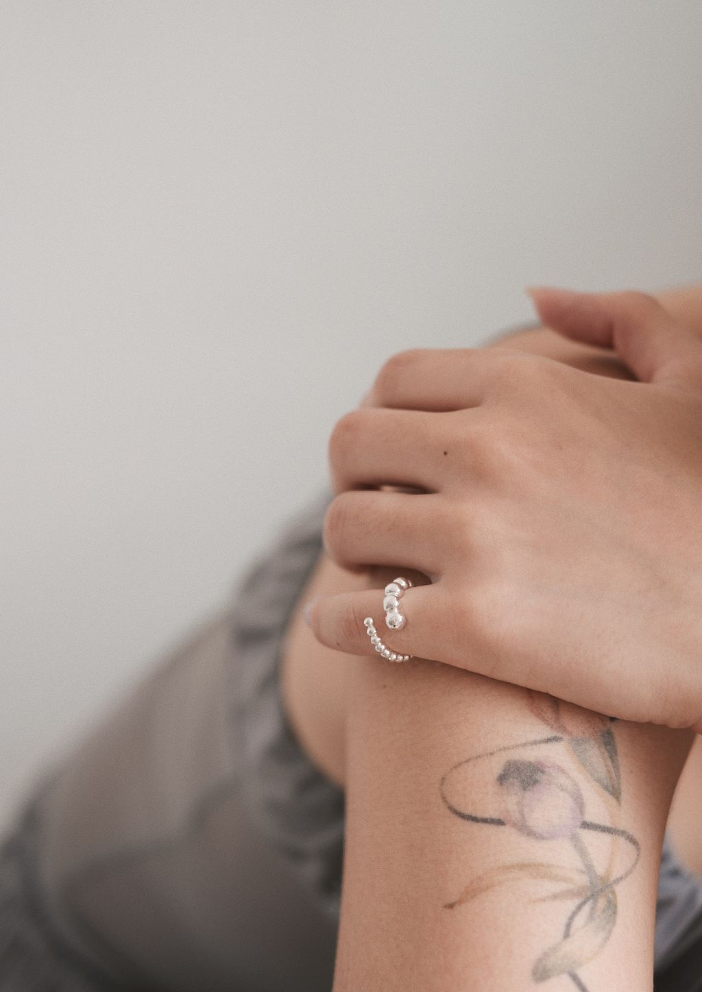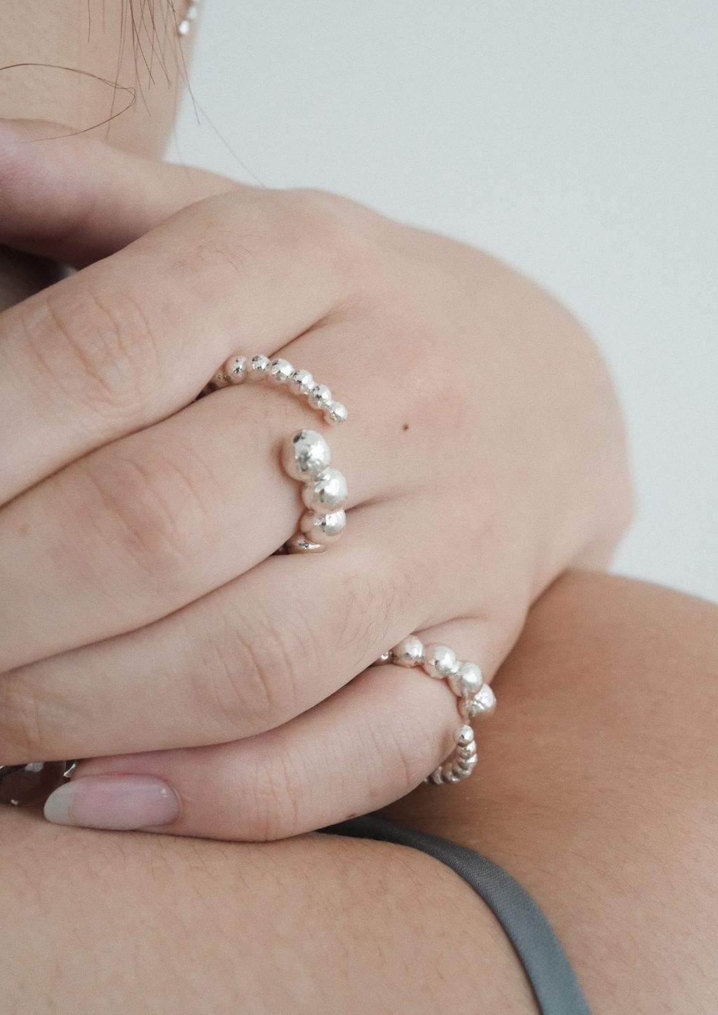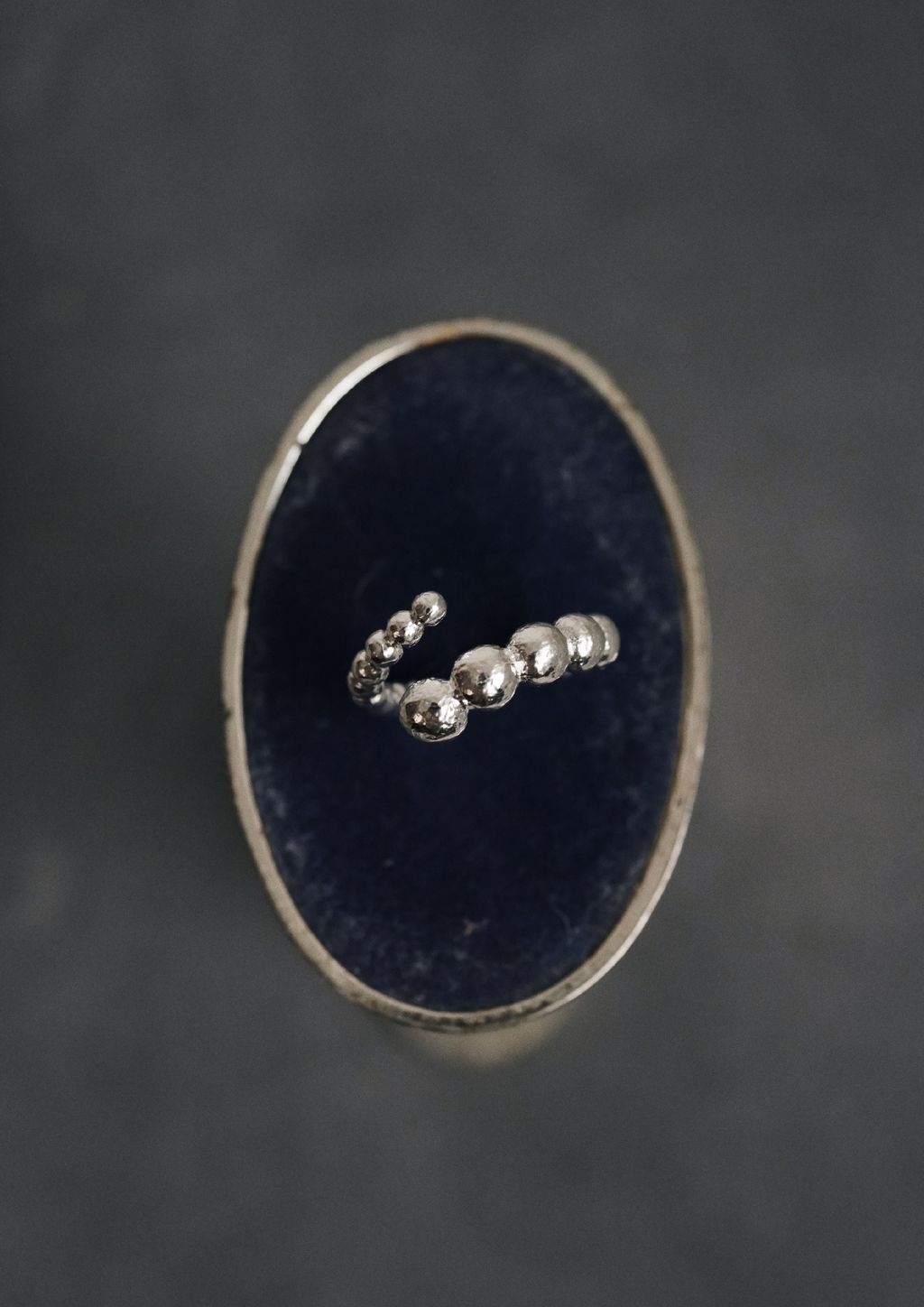 整體戒指線條不規則但流動感強,呈現類似細胞分裂、微生物繁殖或分子聚合的自然狀態,質感是有機而充滿生命力的金屬球體。