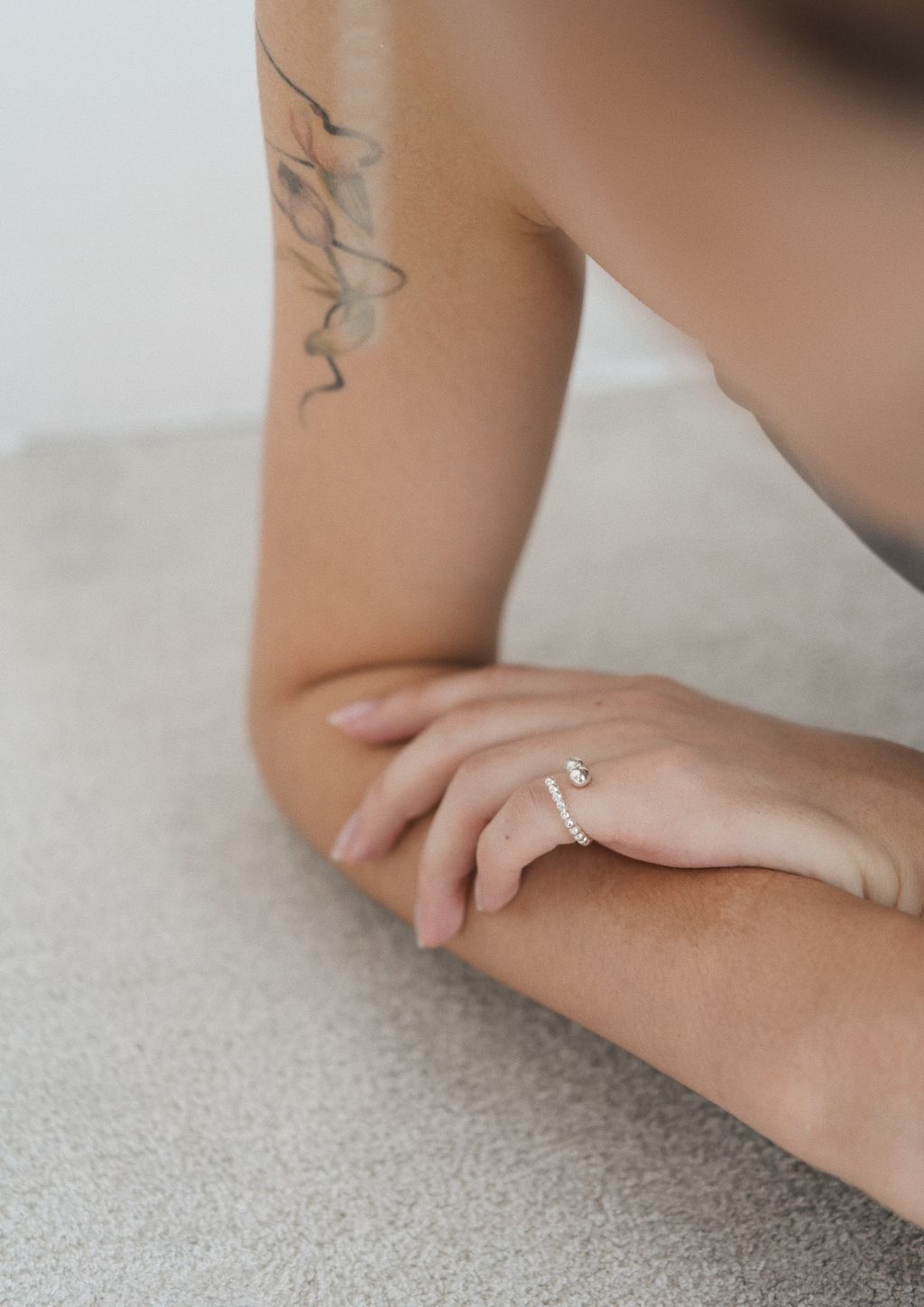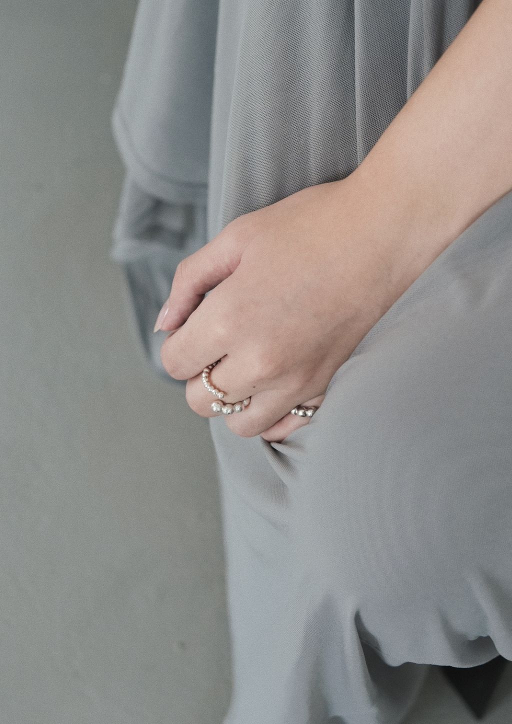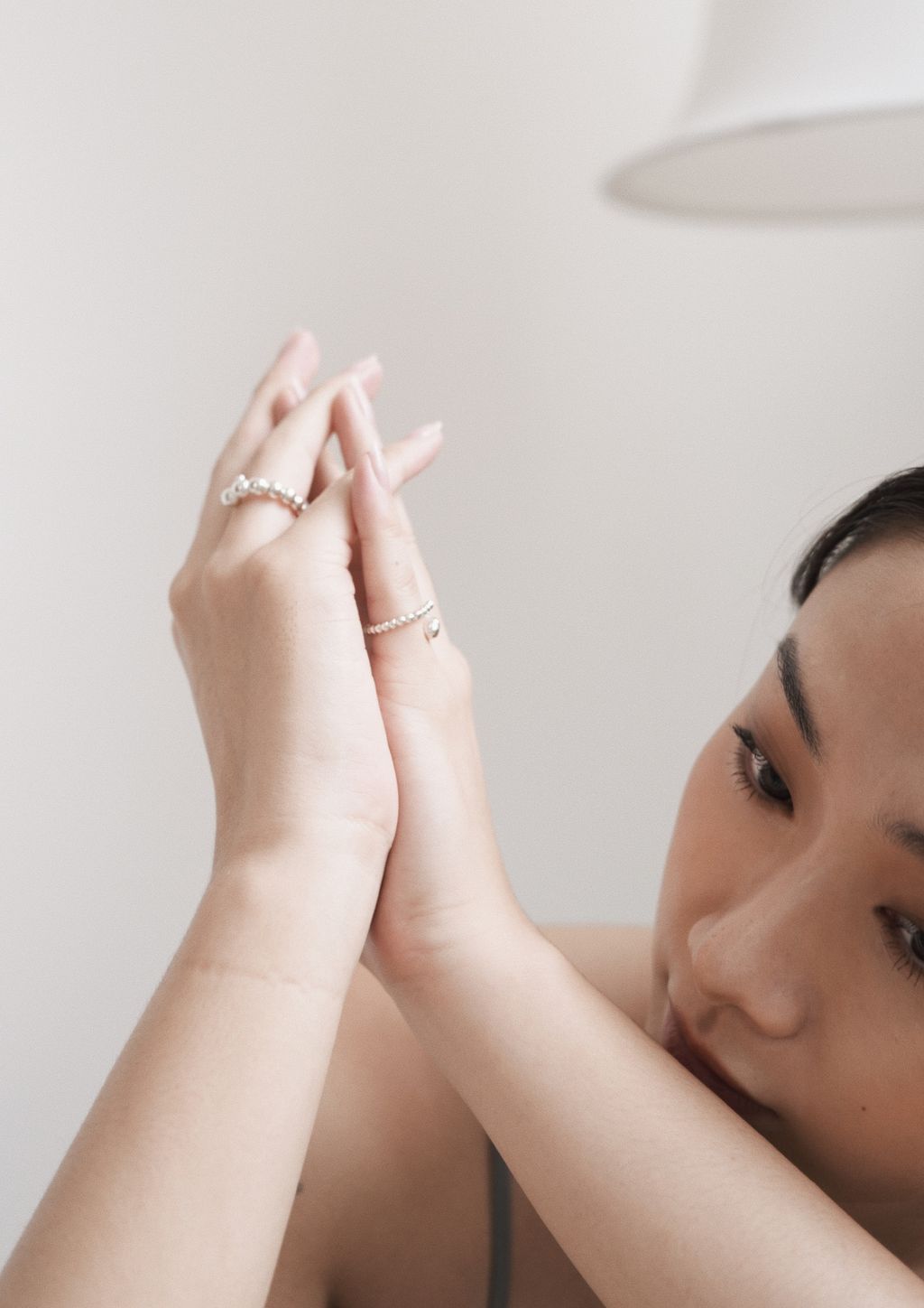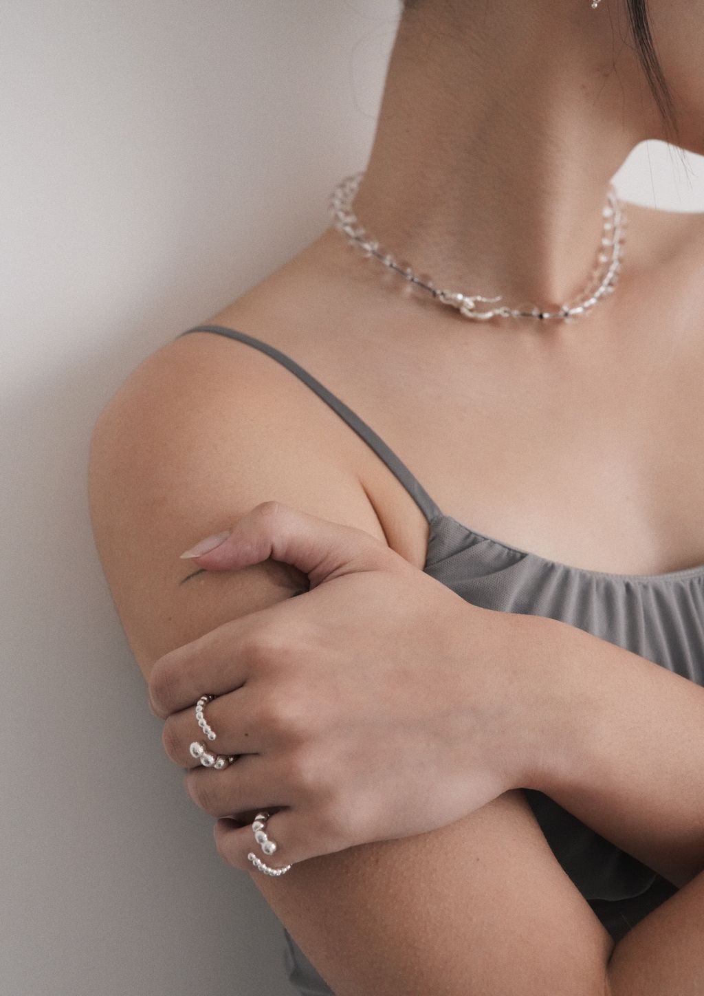 整體戒指線條不規則但流動感強,呈現類似細胞分裂、微生物繁殖或分子聚合的自然狀態,質感是有機而充滿生命力的金屬球體。